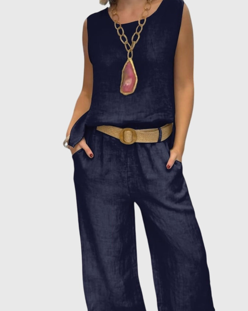 - Effortless Chic: This two-piece set combines a sleeveless top and wide-leg pants for an effortlessly stylish look.